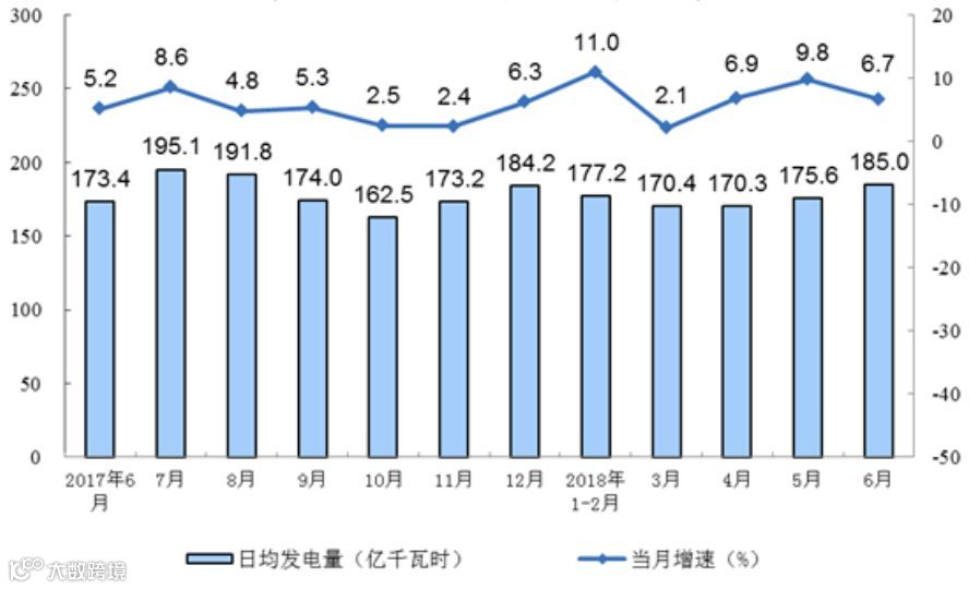 新能源发电增速明显加快,电源结构继续优化。分发电类型看,核电同比增长19.3%,比上月加快4.2个百分点;风电恢复两位数增长,增长11.4%,加快4.7个百分点;太阳能发电增长21.1%,加快6.3个百分点。1-6月份,新能源发电量占全部发电的10.8%,比重比去年同期提高1.0个百分点。