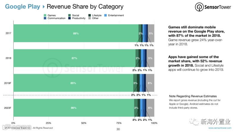 与此同时,游戏应用在谷歌 Play 的收入仍将保持很大份额。到 2023 年,游戏将佔谷歌 Play 收入的 86%,略低于 2017 年的 89%。