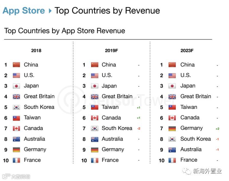 其他值得注意的数据包括,到 2023 年,中国台湾地区将进入苹果 App Store 收入的全球前五大市场之列,为 21 亿美元。在谷歌 Play 收入方面,到 2019 年美国将超过日本。2018 年在日本,谷歌 Play 收入的主要驱动因素是热门游戏,包括“Monstor Strike”和“Fate/Grand Order”等等。预计这部份收入的增长今年将有所放缓。