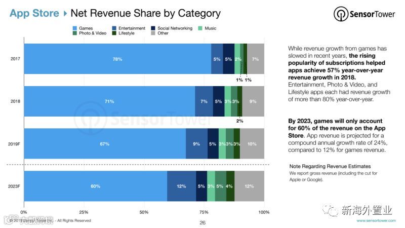 受益于订阅和娱乐类目(例如流媒体应用)的崛起,未来五年 iOS 平台非游戏应用的收入增长(24%)将超过游戏应用(10%)。到 2023 年,非游戏应用将佔 App Store 收入的 40%,为 388 亿美元。