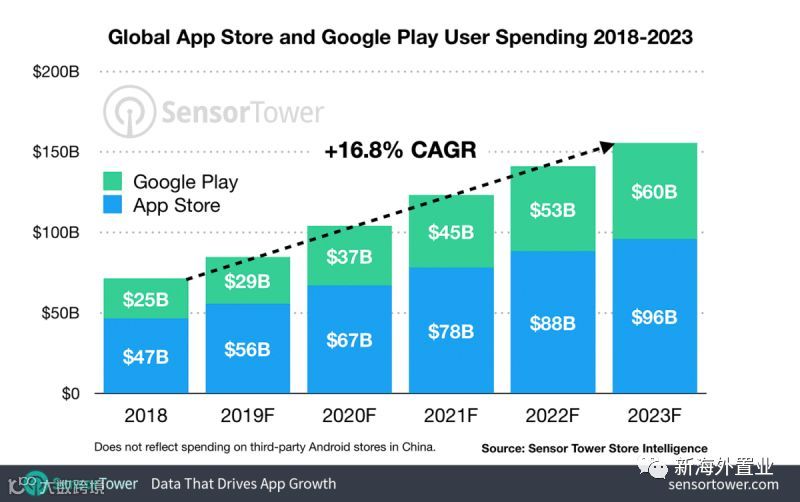 应用市场分析公司 Sensor Tower 今天发布的 最新报告 显示,在全球范围内,苹果 App Store 和谷歌 Play 两大平台的移动应用消费者支出到 2023 年将增长 120%,达到 1560 亿美元。报告预计,未来五年内,这两家应用商店的收入将增长一倍以上。其中,中国、美国和日本将在 iOS 平台处于领先,而美国、韩国和日本则是谷歌 Play 的领先者。