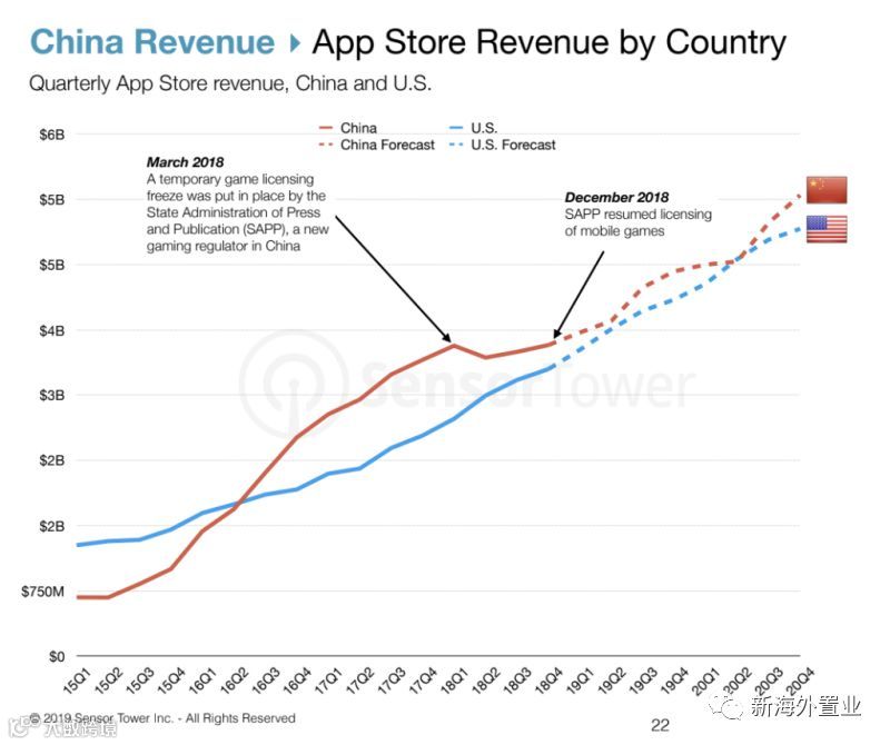 Sensor Tower 还估计,到 2020 年,美国市场苹果 App Store 的收入将短暂超过中国。这个数字与 苹果 iPhone 在华销售放缓 有关,而这样的状况已经导致苹果下调了营收展望。游戏审批冻结也给中国市场造成了重大影响。从 2017 年到 2018 年,中国市场应用下载量下降了 4%,而上年为增长 8%。2018 年,消费者支出仅增长了 14%,远低于前一年的 60%。