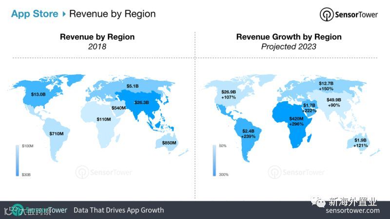 最新预测中反映的另一个趋势是新兴市场的增长。未来五年,非洲和拉美的相关营收增长最快。其中,在苹果 App Store 平台中,前者将增长 296%,至 4.2 亿美元,后者将增长 239%,至 24 亿美元。