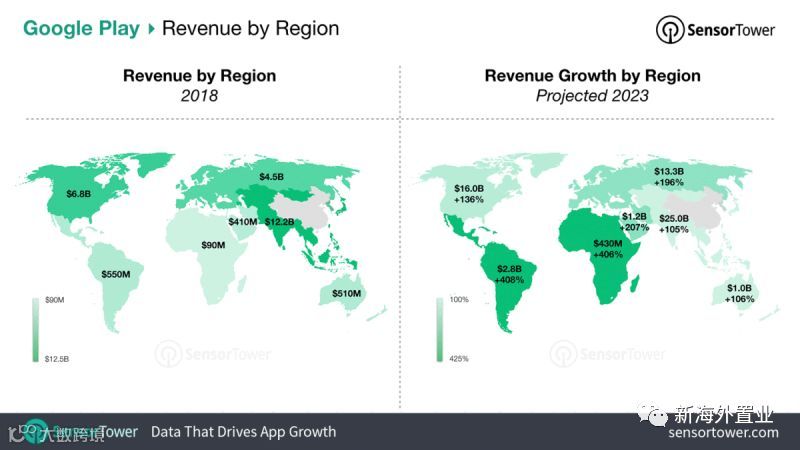 谷歌 Play 平台的营收增幅更大。2023 年,拉美将达到 28 亿美元,较 2018 年增长 408%。非洲将达到 4.3 亿美元,增幅为 296%。