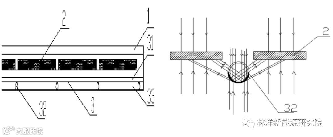 本实用新型中,玻璃盘管位于光伏电池片间隙处,玻璃盘管具有正面透光和背面反光的特性。将正面直射过来的太阳光反射到背面,再次被双面电池所吸收利用,从而提升太阳电池组件的发电功率。
