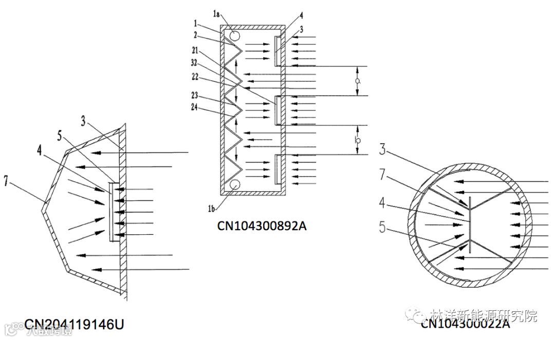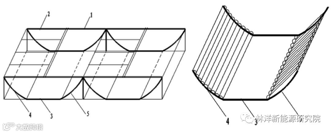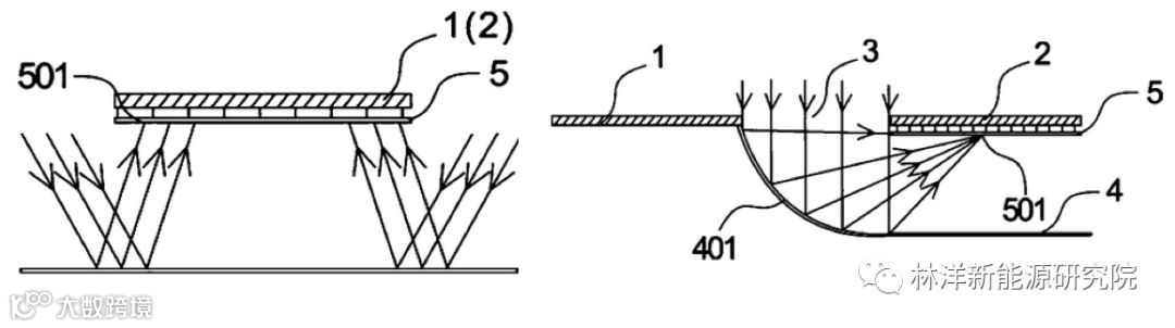 1、第一光伏电池;2、第二光伏电池;3、间隙;4、反射件;401、弧形面;5、匀光件;501、入口。