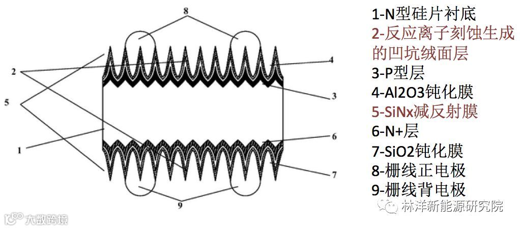 SiNx减反射膜5,起到保护及调整光学参数,折射率范围为2.01~2.1,表面反射率在1%~2%,能够有效降低反射率。
