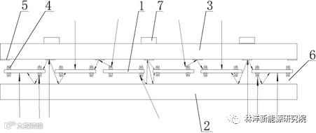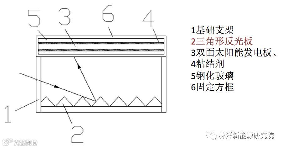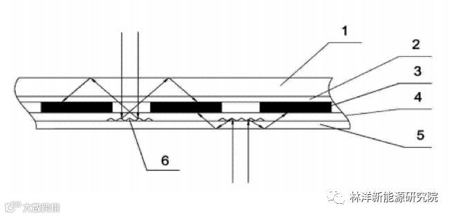 同样,背面太阳光入射到双面太阳电池组件上,由于双面反射膜5的下表面为微棱形结构,则太阳光会反射到高透玻璃1表面,再从高透玻璃1表面反射到双面太阳电池的背面,被双面太阳电池背面所吸收。