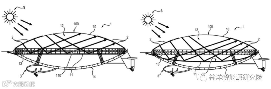 壁10由轻质且对于太阳辐射至少部分透明的材料制成。存在各种适合于该用途的材料:这些特别地包括特别是销售的商标名称为MylarTM的聚氨酯、聚对苯二甲酸乙二醇酯(PET),以及销售的商标名称为RivertexTM的工艺织物。