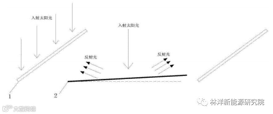 反射板2主要设置在光伏双面发电组件1的背面对应区域,用于接收太阳入射光,并将其反射至光伏双面发电组件1的背面,实现光伏双面发电组件1的背面吸光发电,另外该设置方式中,反射板2与水平地面角度的夹角β可自由可调,实现多种光特性(反射光、折射光和 散射光)的再利用,使得本发明伏双面发电组件1完全发挥双面发电的优势。