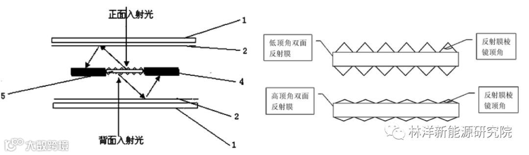 正面太阳光入射到双面太阳电池组件上,穿过高透玻璃1和封装胶EVA2,一部分光射到双面太阳电池的正面,被双面太阳电池的正面所吸收,一部分光射到双面反射膜5的正面,由于双面反射膜5的上表面为微棱形结构,则太阳光会反射到高透玻璃1表面,再从高透玻璃1表面反射到双面太阳电池的正面,被双面太阳电池正面所吸收,直射到双面反射膜5上的光可经过两次或多次反射到双面太阳电池表面。