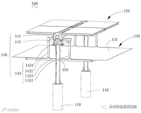 光伏支架系统100包括立柱110、双面发电光伏组件120、反射板130、转动装置140和转轴150。