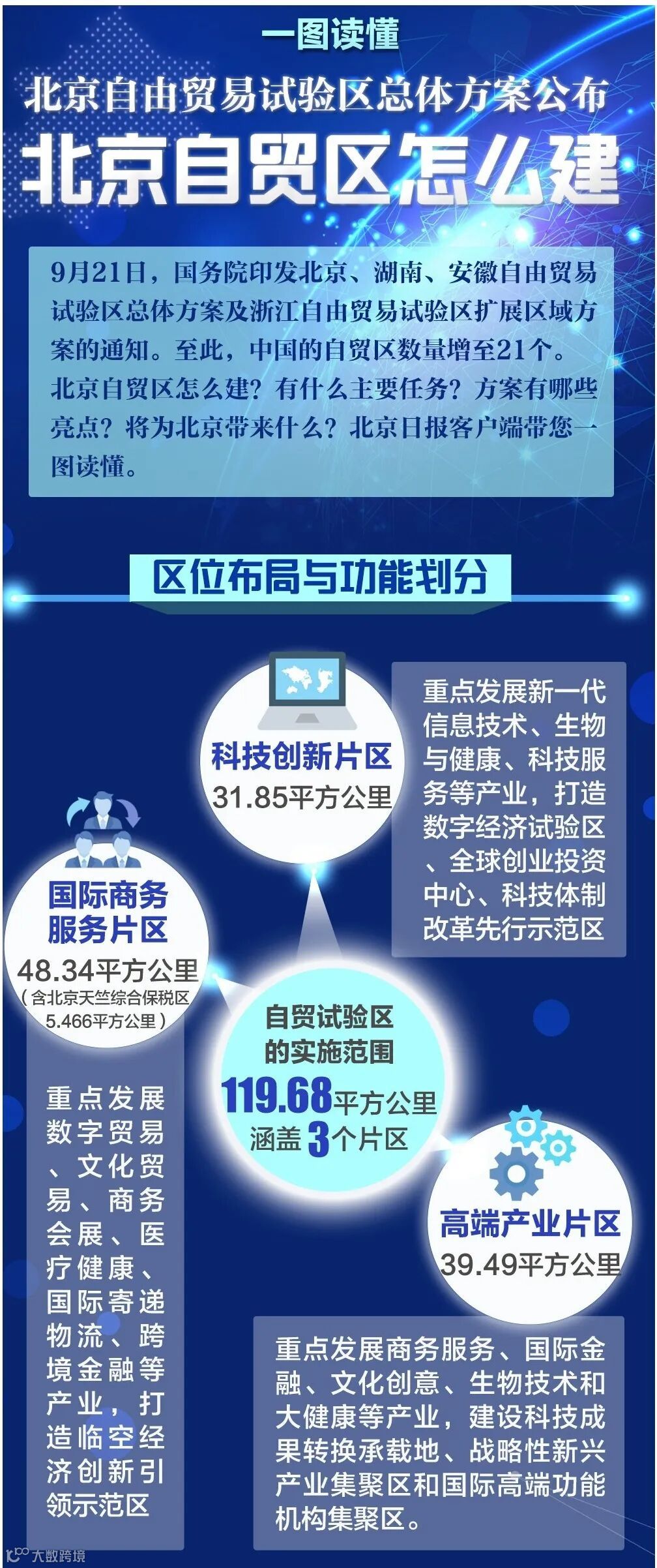 建立中国(北京)自由贸易试验区是党中央、国务院作出的重大决策,北京自贸区的实施范围119.68平方公里,涵盖3个片区,其中,科技创新片区31.85平方公里,国际商务
