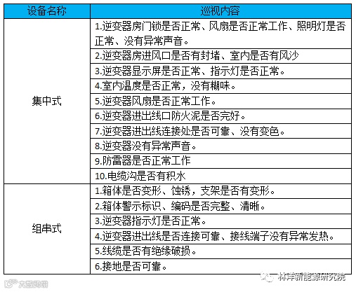 光伏电站常见逆变器主要有集中式和组串式。巡视时主要检查逆变器是否正常工作,指示灯是否正常,风扇是否正常工作等详细如表4。