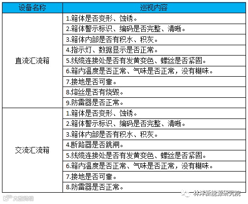 汇流箱包括直流汇流箱和交流汇流箱。一般情况下,直流汇流箱与集中式逆变器配合使用,组串式逆变器与交流汇流箱配合使用。巡视时主要检查箱体是否变形、蚀锈,接线端子是否有松动、变色、发热现象等详细如表3。