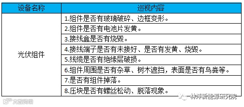 光伏组件问题一般从外观可查。如有发现问题,及时汇报处理,防止问题扩大影响发电量,甚至发生安全事故。巡视时主要检查组件是否破碎,是否有变形,固定是否牢固,接线端子是否接触可靠、没有烧毁现象等详细如表1。
