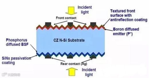 采用先进的原子层沉积Atomic Layer Deposition(ALD)三氧化二铝(Al2O3)方法来钝化电池前表面。Al2O3具有负电荷性,厚度约3-10nm,具有良好的场钝化和化学钝化效果,降低正表面的复合损失,提升电池的开压与电流;同时其钝化不会造成带正电的SiNx所造成的寄生漏电问题,也能够提高填充因子。这种技术能提高电池效率0.2-0.3%左右。而在N-PERT电池背面采用热氧方式生长二氧化硅(SiO2)薄膜来钝化电池背表面,厚度约3-5nm,带有正电荷,其良好的界面钝化性能能有效降低N+层的反向饱和电流密度J0,从而提升电池的开压与电流,效率增益0.1-0.2%。如果匹配选择性发射极技术SE,其效率增益会更加明显,效率增益达0.3-0.4%。
