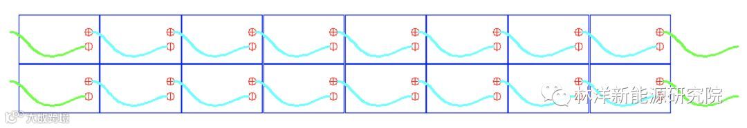 多排布置的光伏组件,每2排光伏组件按C字型串联接线,如上图,以不同颜色区分,共分为上下左右共4个组件串。