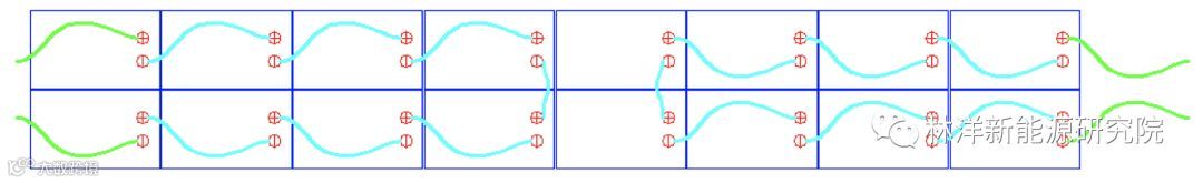 组件串接线方式可以上下两排C型接线,也可以单排一字型接线。组件串至逆变器端接线,也存在多种方式,以一字型组串接线方式为例:
