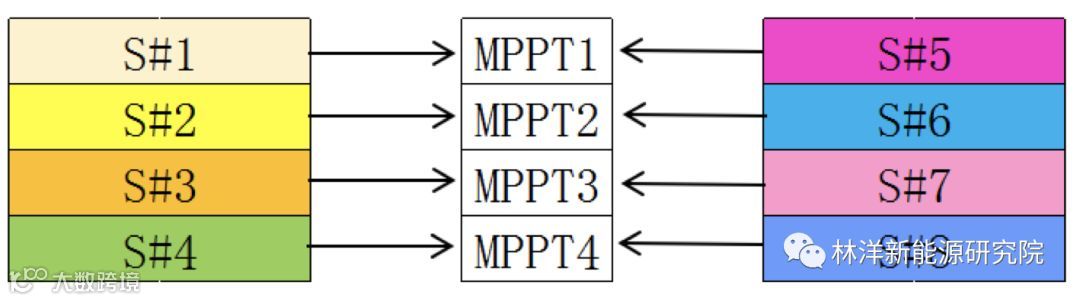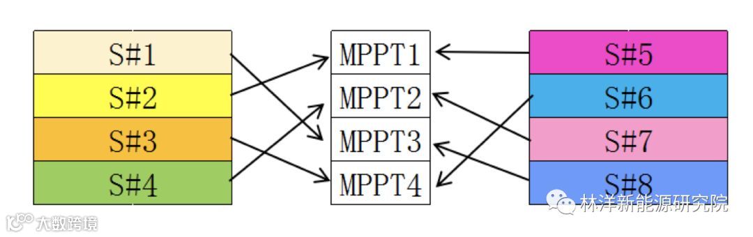假设光伏组件横向四排布置,共2个阵列8个组件串接入1台具有4路MPPT(每路MPPT单元可接入2个组件串)功能的逆变器。