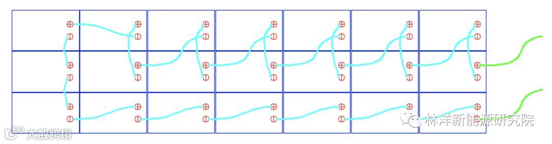 当光伏组件采用奇数(比如21件)块串联时,可能会采用3排布置的形式,这种情况光伏组件接线比较复杂,一般很少采用: