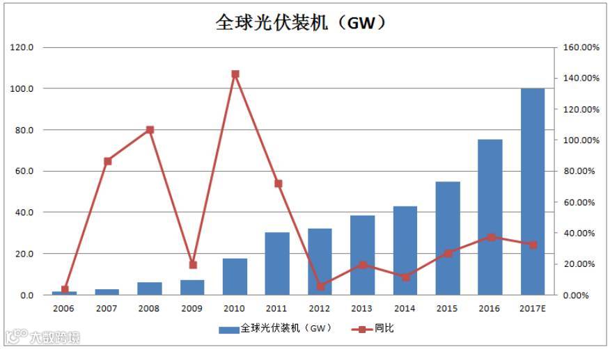 2017年,全球光伏新增装机量将首次超过100GW,同比增加35%左右。