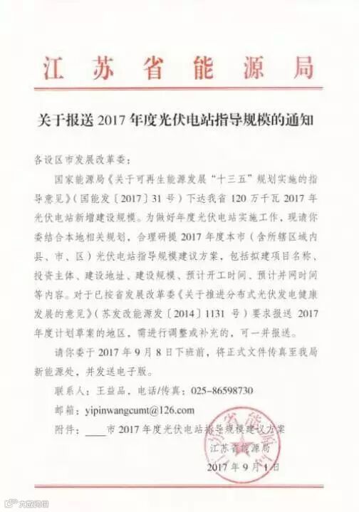 9月1日,江苏省能源局发布《关于报送2017年度光伏电站指导规模的通知》。要求9月8日前,上报2017年江苏新增光伏指标1200MW分配方案。包括项目名称,投资主体、建设地址,建设规模,预计开工时间,预计并网时间扥该内容。