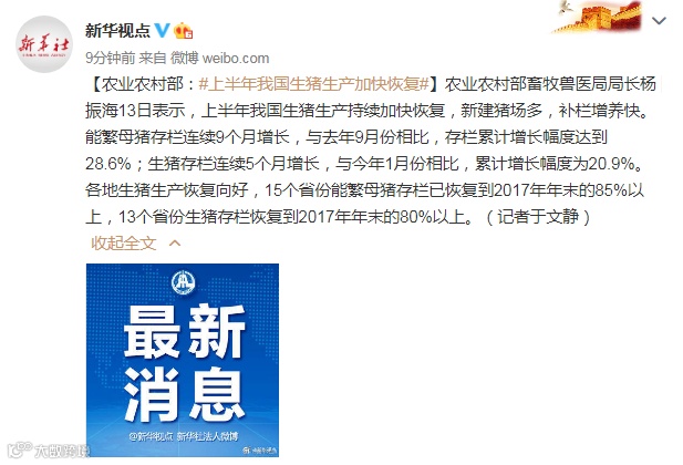 导读:农业农村部畜牧兽医局局长杨振海13日表示,上半年我国生猪生产持续加快恢复,新建猪场多,补栏增养快。
