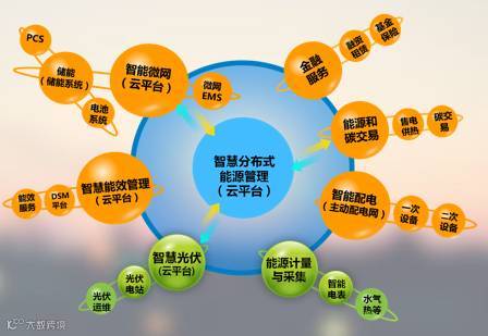 “1+ N +T”模式,其中“1”代表了一个平台,“N”表示N个子系统,“T”代表灵活的能源交易。通过搭建虚拟微网,构建清洁分布式能源的柔性生产和消纳体系。同时结合绿色碳业务,提供一站式多元碳资产服务体系。