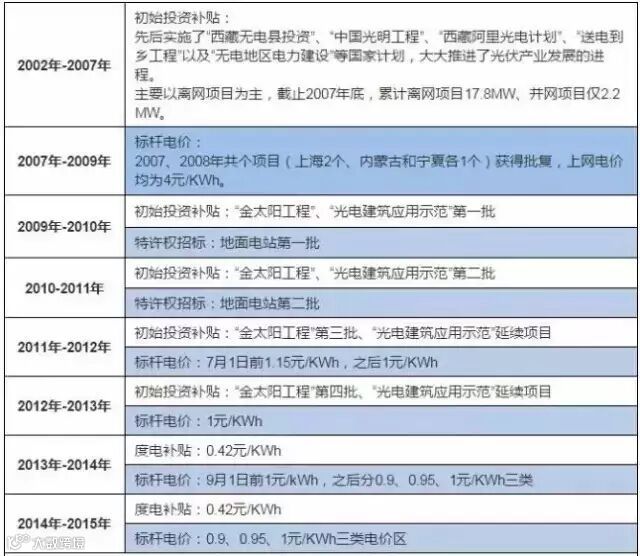 对于大型地面电站项目,基本采用标杆上网电价的补贴形式,只是在不同时期电价标准不同;在2009、2010两年,采用特许权招标对上网电价进行了摸底。2009年的“金太阳工程”和“光电建筑应用示范”项目推出以后,极大地刺激了分布式市场,国家补贴也是特别多,有初装补贴,之后还增加了标杆电价补贴,标杆电价补贴最高达到了1.15元/度。