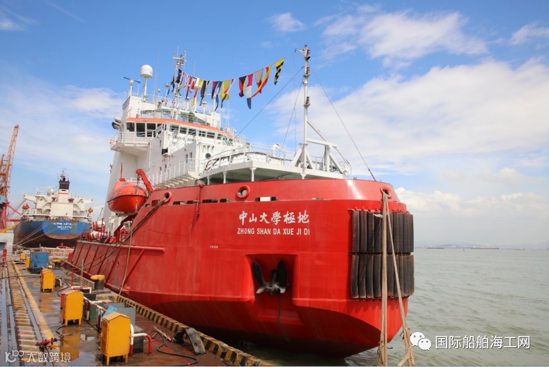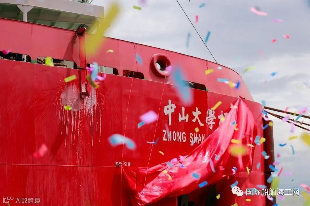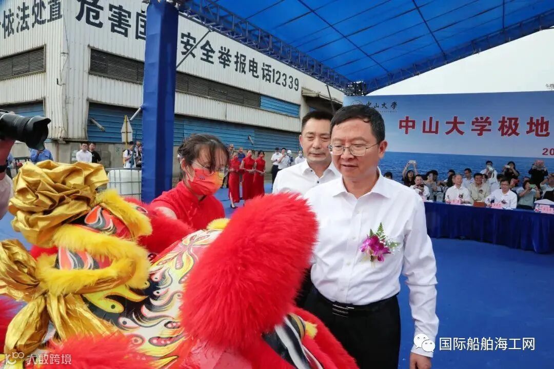 中山大学党委书记陈春声,中国科学院院士、中山大学校长高松一起为该船点睛,广船国际董事长陈忠前、党委副书记张庆环陪同见证。