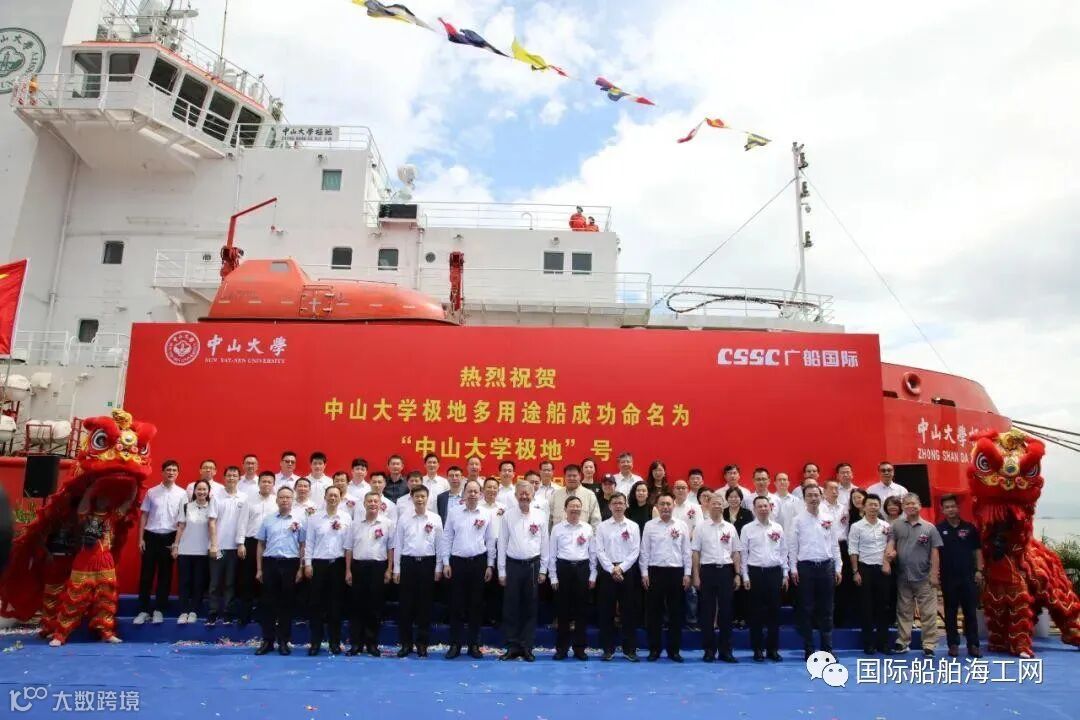 9月30日,中国船舶集团旗下广船国际所属文冲修造举行“中山大学极地”号极地破冰多用途船命名仪式。中山大学党委书记陈春声,中国科学院院士、中山大学校长高松,广州市南沙区委副书记、区长吴扬,广东省科技厅副厅长吴世文,自然资源部广州海洋地质调查局副局长雷勇,中国科学院南海海洋研究所副所长林强,自然资源部南海局保障中心主任李瑞山,广船国际党委书记、董事长陈忠前,广船国际党委副书记、文冲修造党委书记张庆环,广船国际副总经理周旭辉,广船国际副总经理、文冲修造总经理谢俊鹏出席仪式并见证命名。