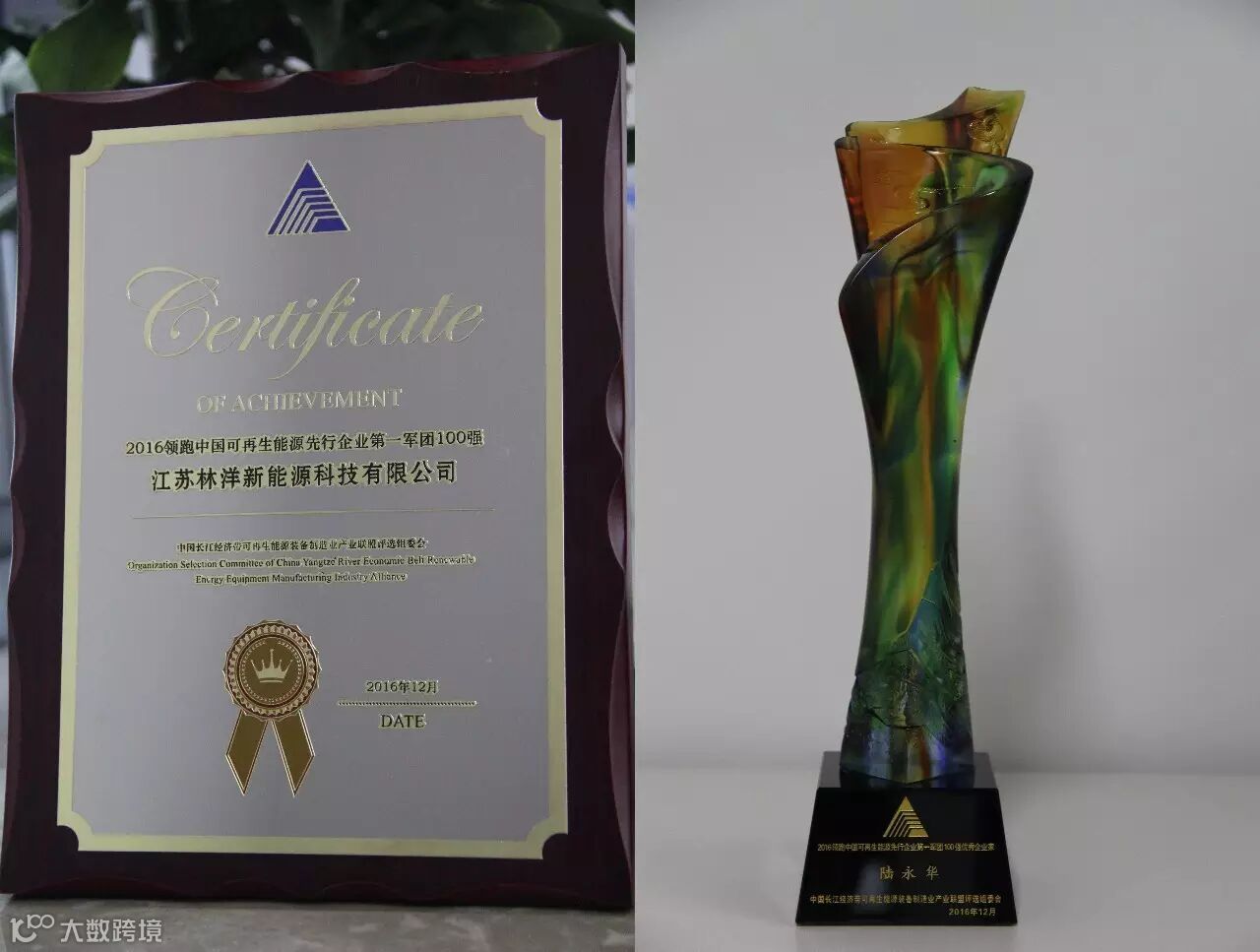 2016年对于林洋来说,是斩获颇丰的一年。继11月连续获得多项荣誉之后,12月12日在江苏南京举行的2016年第六届加强应用长江经济带“一带一路”分布式能源创新发展论坛上,江苏林洋能源股份有限公司董事长陆永华先生荣获此次论坛颁发的“优秀企业家”奖,江苏林洋新能源科技有限公司入围2016 领跑中国可再生能源先行企业第一军团100 强榜单。