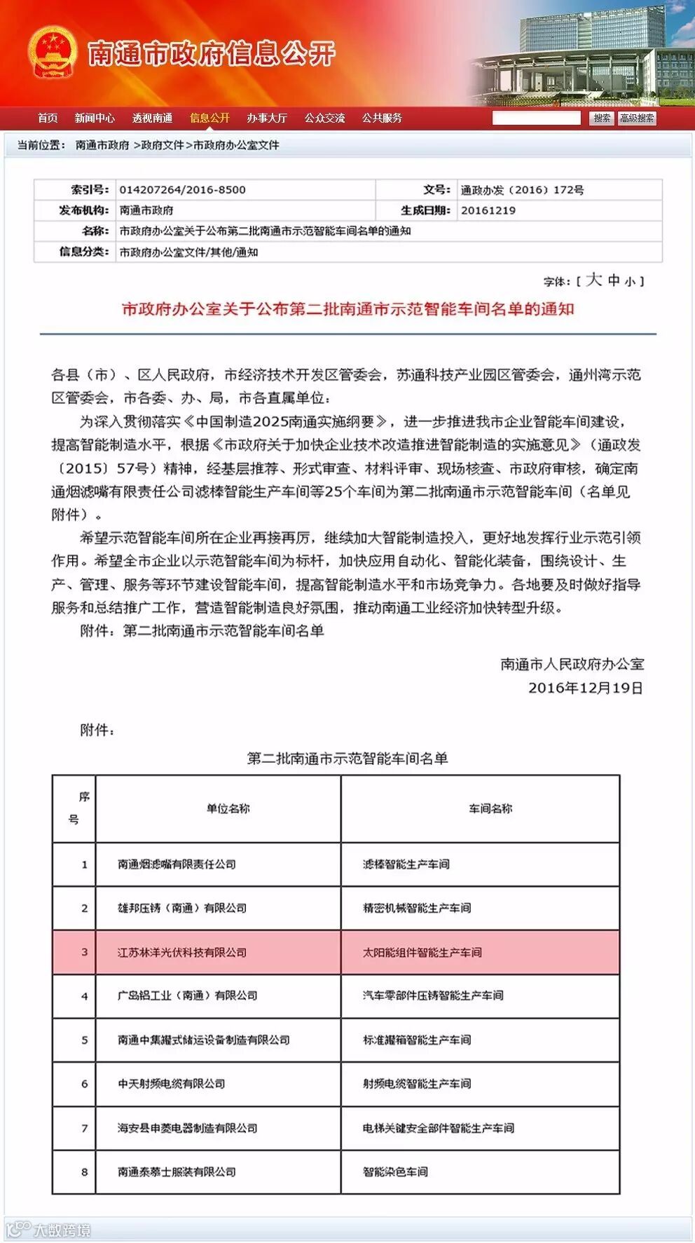 近日,南通市人民政府办公室公布了2016年示范智能车间评选结果,江苏林洋光伏科技有限公司太阳能组件智能生产车间成功获评。此次评审,由南通市经信委联合专家组对公司进行全面、综合评估,经过基层推荐、形式审查、材料评审、现场核查等审核过程最终评定。南通市示范智能车间建设是实施技术改造、提高智能制造水平,推进制造业向中高端迈进的重要举措,是南通市对"中国制造2025"制造强国战略的成功实践。