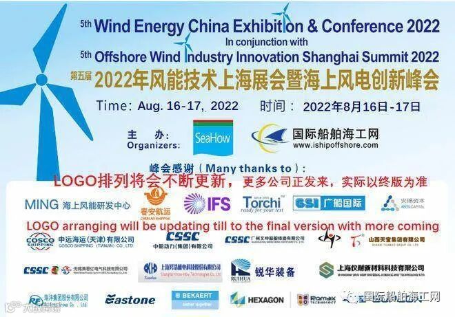 为交流海上风电高质量发展新机会和趋势,计划于2022年8月16日-17日线上线下同时召开第五届“2022年风能技术上海国际大会”暨“2022年海上风电产业创新发展上海国际峰会”。咨询:china@ishipoffshore.com 或 chinabobli@126.com