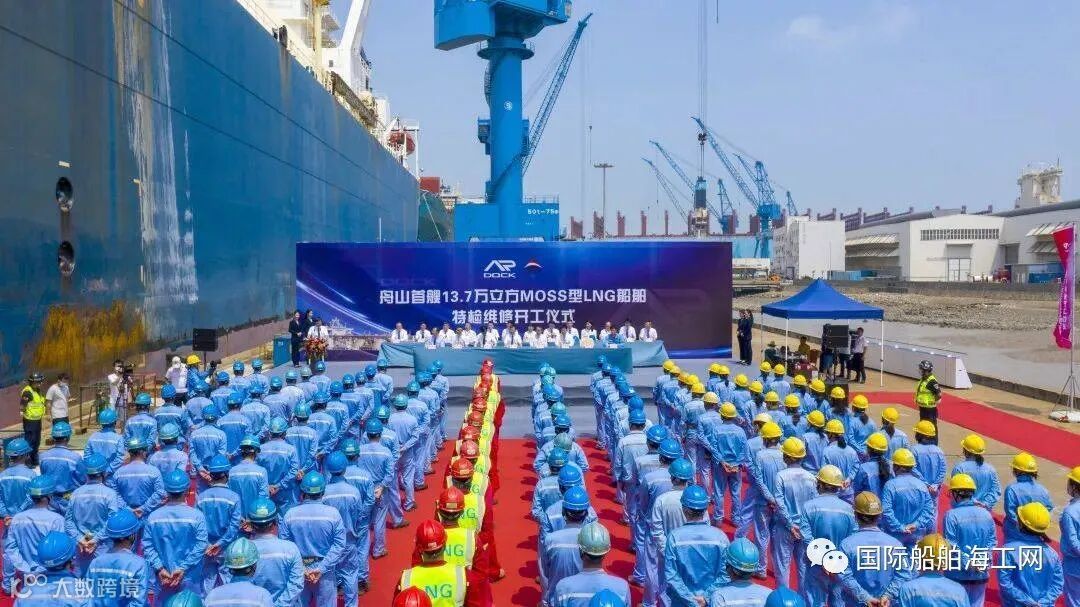 2022年7月25日上午10时28分,舟山首艘13.7万立方MOSS型LNG船舶特检维修开工仪式在民营船厂舟山亚泰9号泊位隆重举行。
