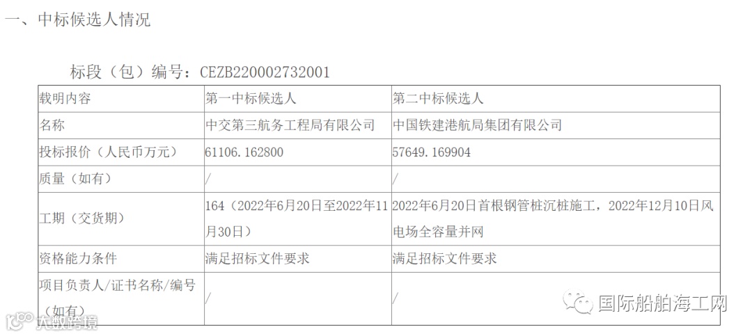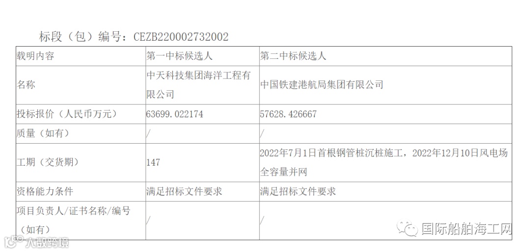 标段二:第一中标候选人为中天科技集团海洋工程有限公司,投标报价为63699.022174万元。第二中标候选人为中国铁建港航局集团有限公司,投标报价为57628.426667万元。