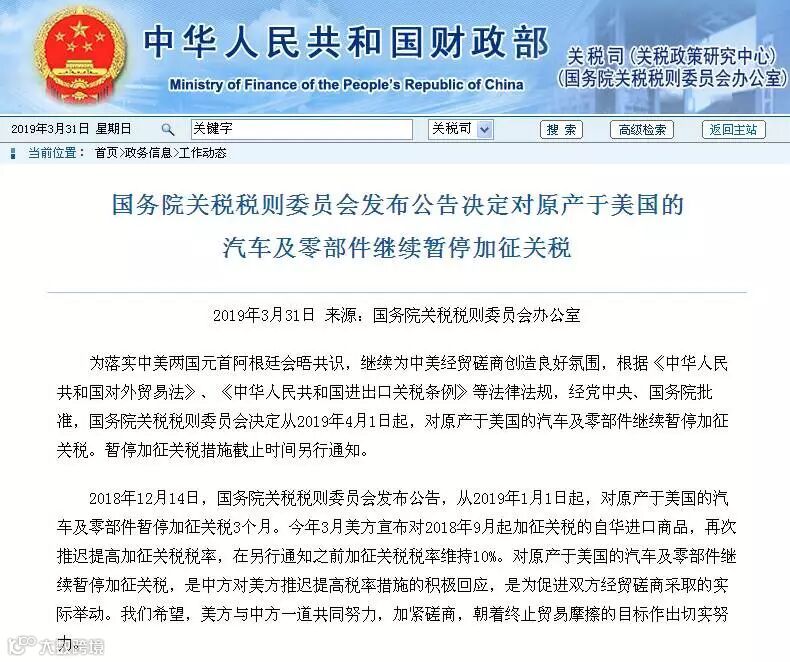 为落实中美两国元首阿根廷会晤共识,继续为中美经贸磋商创造良好氛围,根据《中华人民共和国对外贸易法》、《中华人民共和国进出口关税条例》等法律法规,经党中央、国务院批准,国务院关税税则委员会决定从2019年4月1日起,对原产于美国的汽车及零部件继续暂停加征关税。暂停加征关税措施截止时间另行通知。