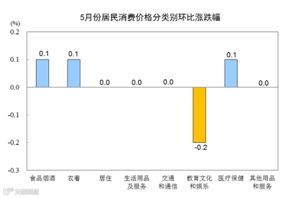 5月份,全国居民消费价格环比持平。其中,城市持平,农村上涨0.1%;食品价格上涨0.2%,非食品价格持平;消费品价格上涨0.1%,服务价格下降0.1%。