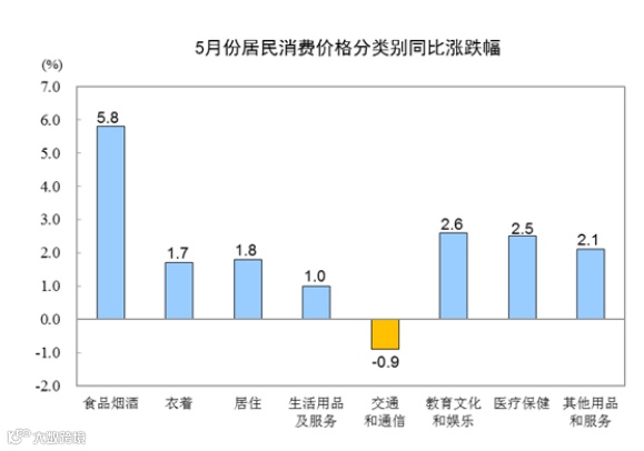 5月份,食品烟酒价格同比上涨5.8%,影响CPI(居民消费价格指数)上涨约1.69个百分点。其中,鲜果价格上涨26.7%,影响CPI上涨约0.48个百分点;鲜菜价格上涨13.3%,影响CPI上涨约0.31个百分点;畜肉类价格上涨12.5%,影响CPI上涨约0.51个百分点(猪肉价格上涨18.2%,影响CPI上涨约0.38个百分点);鸡蛋价格上涨8.7%,影响CPI上涨约0.04个百分点;禽肉类价格上涨6.4%,影响CPI上涨约0.08个百分点;粮食价格上涨0.5%,影响CPI上涨约0.01个百分点;水产品价格下降0.4%,影响CPI下降约0.01个百分点。