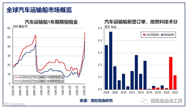 总体而言,尽管全球宏观经济和汽车生产均面临挑战,但在需求持续强劲、运力供给紧张以及船队更新的共同作用下,全球汽车运输船市场已重回航运业的赛道上。