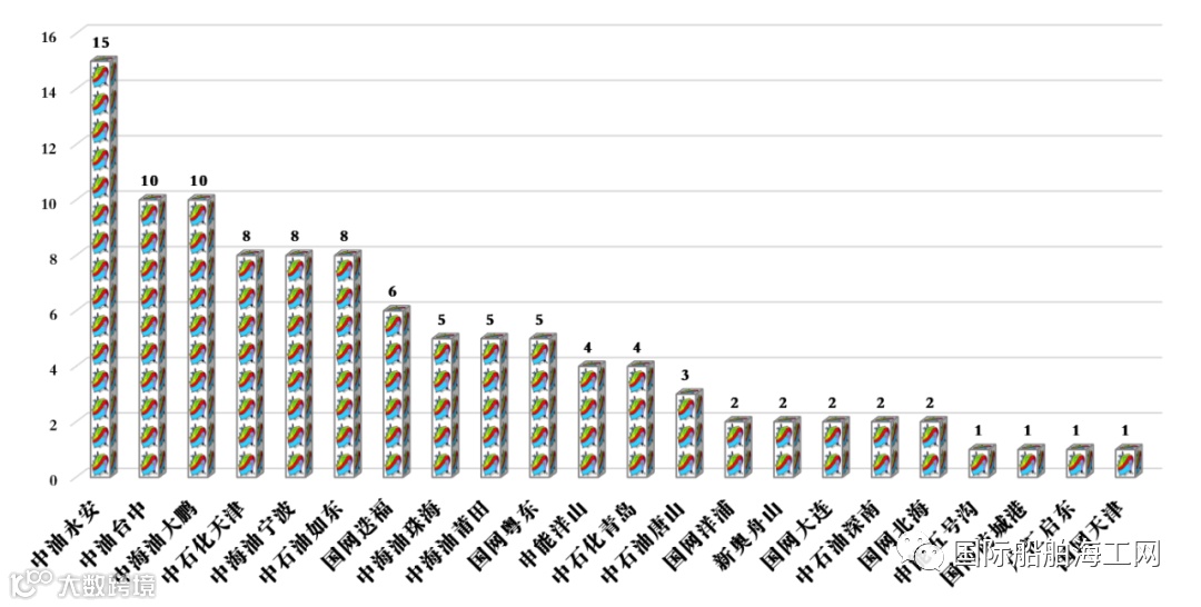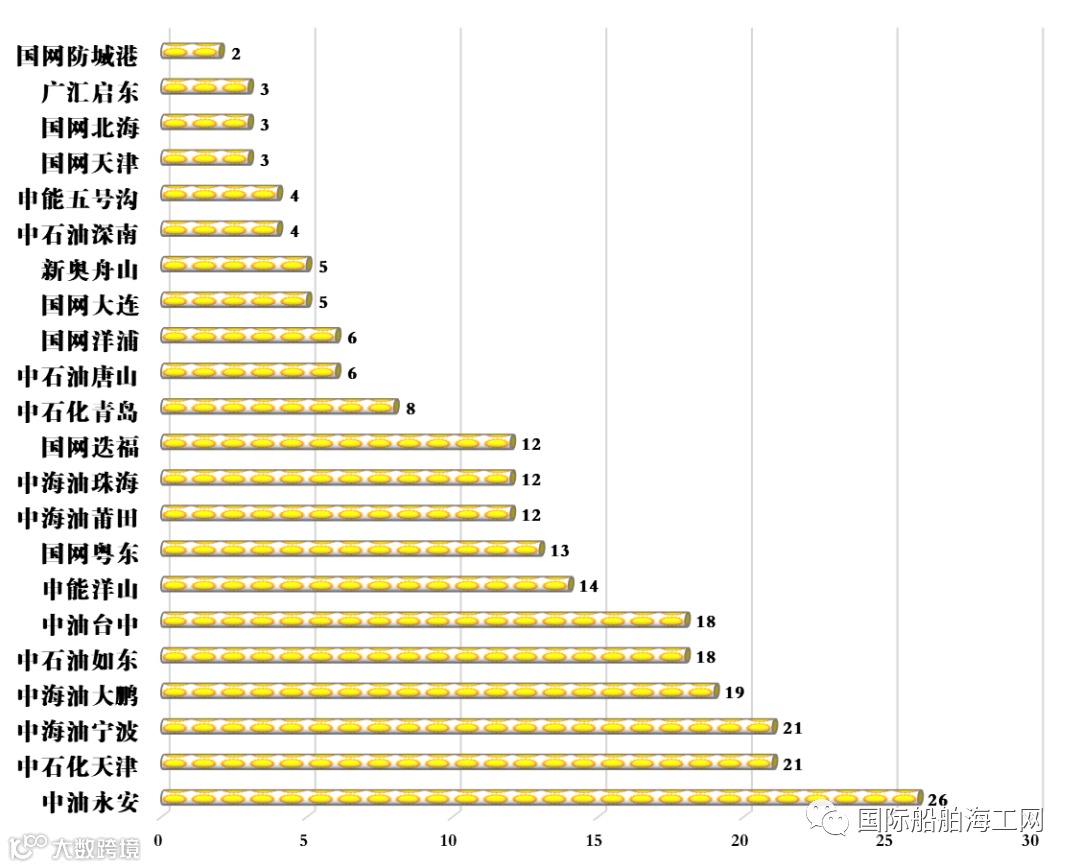 2022年5月,全国所有LNG接收站总共到港LNG船舶105艘,中油永安、中油台中、中海油大鹏、中石化天津、中海油宁波、中石油如东分别以15艘、10艘、10艘、8艘、8艘、8艘名列前六。