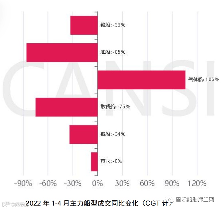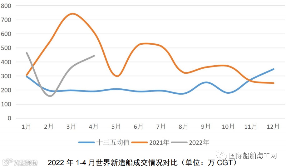 2022年4月世界新造船市场成交802万DWT、443万CGT,同比分别下降49.8%、27.4%;1-4月累积成交2854万DWT、1466万CGT,同比分别下降45.4%、23%。同比数据受去年市场同期成交的高基数影响依旧出现了较大波动,但可以看到4月降幅明显收窄,而且3、4两月连续反弹,4月当月实现环比增长22.7%。以CGT计,1-4月累积成交量较“十三五”同期水平超出66.8%,增幅较一季度同期比较扩大23.2%。