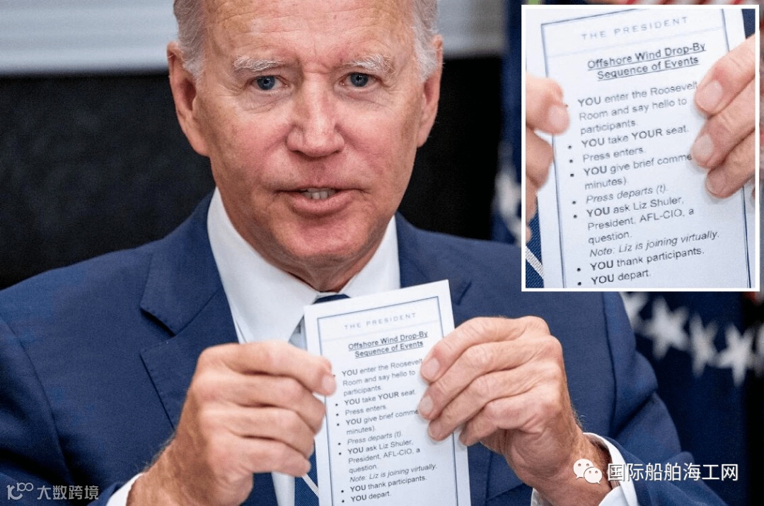美国总统拜登在当地时间6月23日,出席海上风电会议与风电行业高管举行了一次会议。当时,他将一张备忘单提示卡拿起时正反面颠倒了,备忘单正面恰好被一名摄影师拍了下来。可以看到,这张为拜登准备好的题为“海上风电会议活动顺序”的说明书,详细地告诉了拜登每一步该怎么做。该备忘单上指示这位领导人何时“就座”,并将其发言限制在“2分钟”之内。《纽约邮报》称,这张“略显滑稽的详细备忘单”被现场一名摄影师拍下。