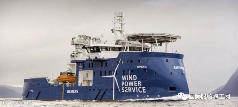 除常规的运维船外,运维母船是新的发展趋势,典型的母船可供超过40人居住,可运载零部件,自持力超过1个月,具备优良的靠泊性能,搭载波浪补偿悬梯及动力定位系统。但其造价和运营成本较高,目前应用相对较少。图3为乌斯坦建造的“WindeaLeibniz”运维母船,该船在船首航行状态下航速为13.9kn,而船尾航行状态可达到12.1kn,独特的设计使船只更加灵活,运维作业效率更高,燃油经济性更佳。若要进行齿轮箱、发电机和叶片等大型部件的更换,则需使用自升式运维船,其搭载了较大型的起重机,可在40m水深条件下作业,适用于深水远岸风机的运维作业。