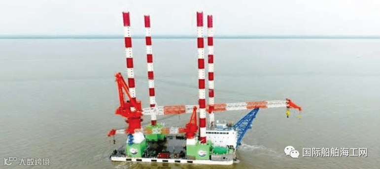 图4为“海电运维801”号自航自升式运维船,该船由福建马尾造船股份有限公司建造,桩腿长95m,最大作业水深50m,最大起重高度120m,配备DP1动力定位系统,以及4套全回转推进器,可装载2套8MW海上风机的叶片和机舱。