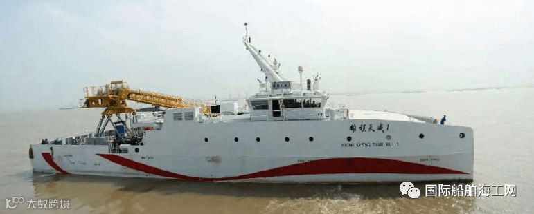 根据我国不同海域海上风电项目的特点,有针对性地选择不同形式的运维船。江苏沿海项目多坐落于潮汐带水域,作业水位0~20m,风速3m/s~7m/s,波高0.5m~4.6m,已建成风场离岸距离3km~50km,波浪平均周期3.1s,此海域适合采用双体船、小水线面双体船以及居住船等。福建、广东以及浙江沿海海域海况复杂多变,岛礁、暗礁多,涌浪大,水流急,风浪大,水深10m~50m,年平均风速8.0m/s,平均波高2.0m,已建成风场离岸距离3km~30km,此海域项目离岸较近,可选用抗风浪能力强、航速快的小水线面双体船、表面效应船和小水线面三体船等。渤海和北黄海区域的海况优于多风的福建以及处于潮汐带的江苏沿海,但该海域冬季会出现海冰,运维船舶需在艏部增设B级冰区加强的破冰装置,并增加保暖防冻设备。图2为2020年7月18日交付的“雄程天威1”双体运维船,该船搭载了先进的舰船低压直流综合电力技术,这是此项技术在民船领域的首次应用。