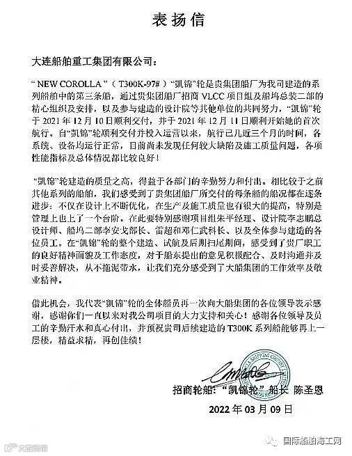 国际船舶海工网近日,中国船舶集团旗下大船集团收到招商轮船30万吨VLCC“凱锦”轮船长的表扬信,信中对该船招商VLCC项目组、船坞二部以及相关单位的高度重视和统筹安排表示感谢,对该船设计优化、生产组织及施工质量给予充分的肯定,对全部参与施工的团队精细管理、高效施工,克服种种困难,高质量完成所有节点提出了表扬。
