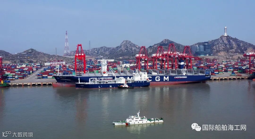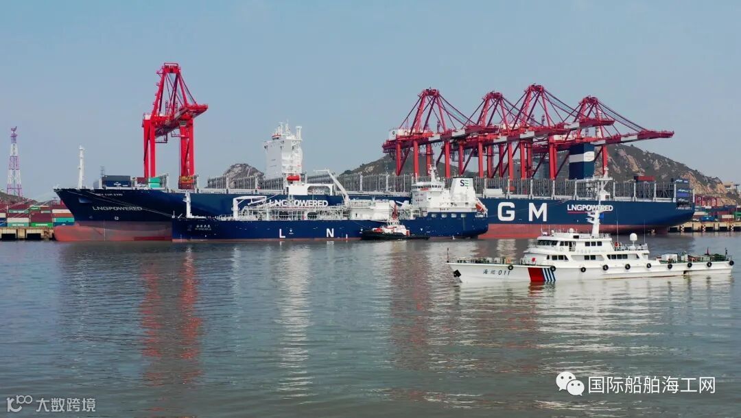 上海自贸区临港新片区又落地“中国首单”!洋山港完成大型双燃料集装箱船LNG“船-船”同步加注。