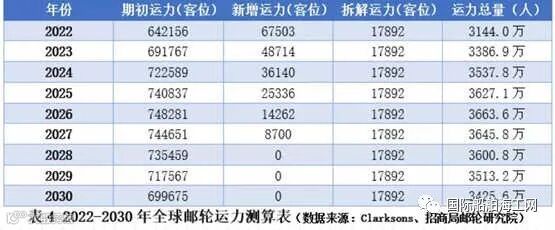 根据现有邮轮船队和计划交付情况,可以得知全球邮轮运力现状及增加情况。同时,目前全球邮轮船队中20年船龄以上的老旧邮轮总数为208艘、161026客位。随着运营压力增大和绿色、环保要求的日趋严格,这些老旧邮轮将呈加速淘汰趋势,为计算方便起见,假设2021-2030年间,平均每年淘汰运力17892客位。因此,在现有订单不被取消和没有出现更多现有运力淘汰的情况下,得出2022-2030年全球邮轮运力总量结果如表所示: